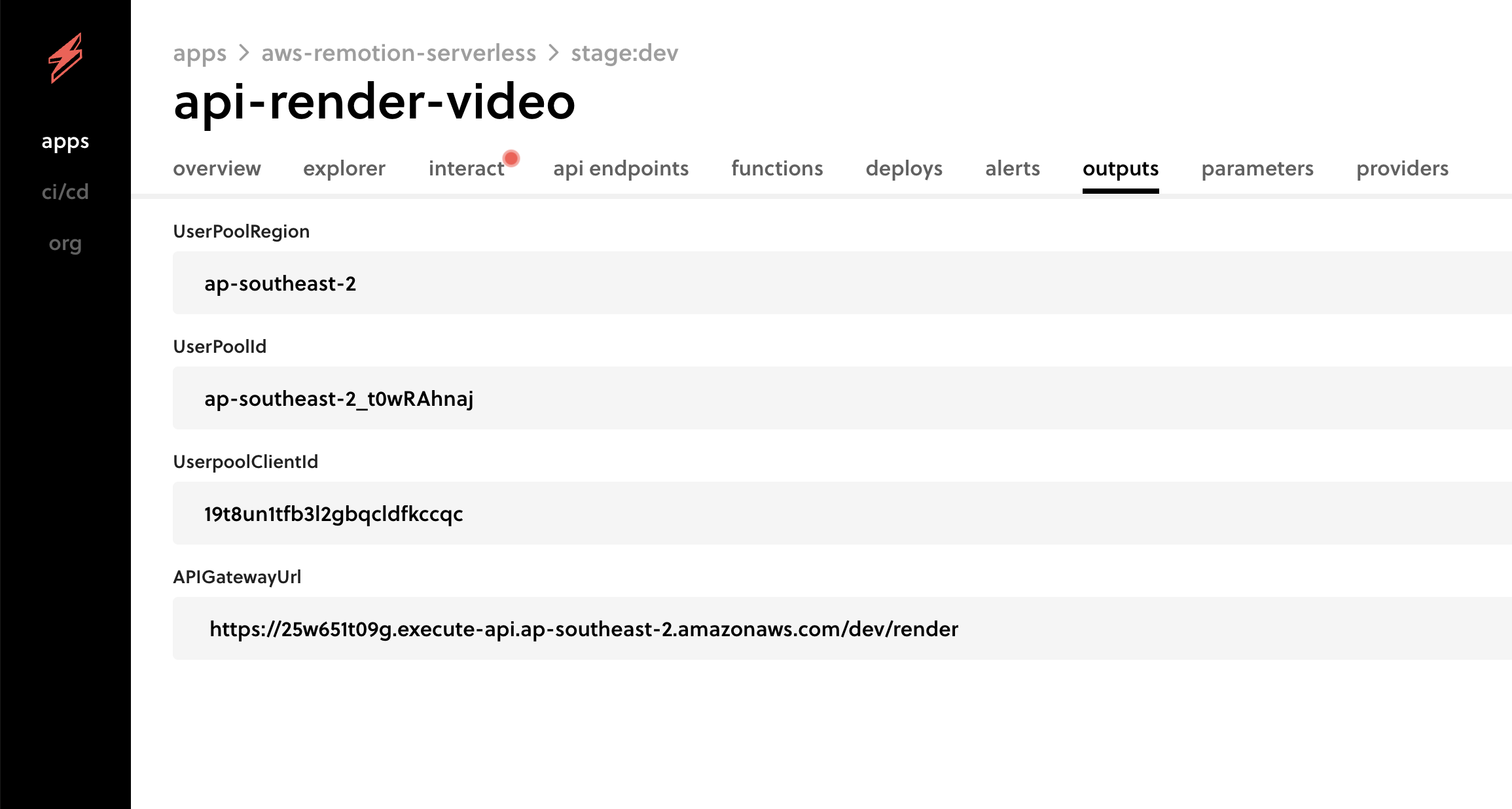 The API requires an authorization token to interact with it. To obtain the token, first go to the serverless dashboard to retrieve outputs such as UserPoolRegion, UserPoolId, and UserPoolClientId, which are used to authenticate with Cognito. If you do not have a frontend application, you can create a user and an authentication token manually for the API by following this guide.